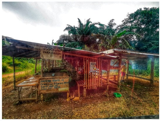 Limited basic resources such as water and electricity supply, telephone and internet lines, as well as road connections were common in the villages. For example, the village roads were not paved and the roads were occasionally blocked due to erosion during heavy rains. Villagers faced frequent interruptions to clean water supplies and poor coverage of internet connections. During the pandemic, when school classes were conducted online, children were exposed to mosquito bites as they needed to climb hills to connect to the internet. Those who require online access are exposed to a similar risk. In certain areas, “sulap” or small huts were built to serve as multipurpose buildings for rest, online activities, and sleeping after farming activities (Figure 9). Based on information from gatekeepers, the river is their water source for laundry, bathing, and washing dishes. These limited resources affect malaria control efforts, as they increase human contact with mosquito bites.