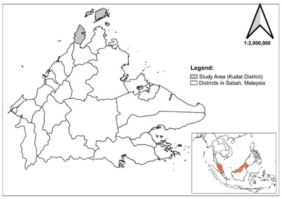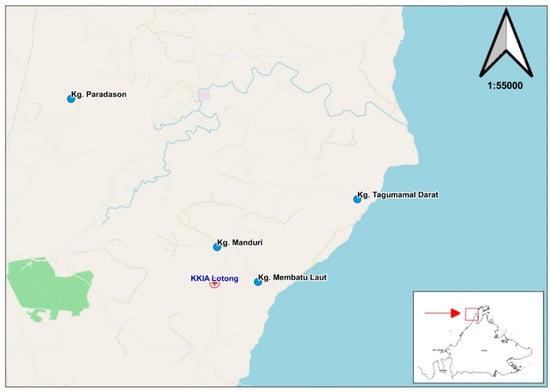 The study was conducted in the P. knowlesi malaria-endemic area Matunggong, Kudat in Sabah, Malaysia []. Approximately 101,700 people live in Kudat, the majority of whom are of Rungus ethnicity and Christian religion []. They live in hamlets that consist of several houses or longhouses []. The majority of the community members work as farmers [], workers at oil palm plantations [,], and other forest-related employment []. Previous studies associated the communities of Kudat, Sabah as highly exposed to P. knowlesi malaria [,]. In Kudat, the P. knowlesi malaria incidence was estimated to be as high as 4.29% to 8.82% in the central eastern part of the district, where there is an expansion of oil-palm plantations surrounded by dense forest []. In this district, 6.2% of asymptomatic cases were detected among those who were not previously considered high risk, such as women and children below 15 years old []. The detection of peridomestic and asymptomatic infections highlights the threat of this zoonotic disease in the community []. There is a temporal relation with the monsoon season, as P. knowlesi malaria cases increase throughout the year after the rainy season; either during the northeast monsoon from May to September or the southwest monsoon from November to March [].