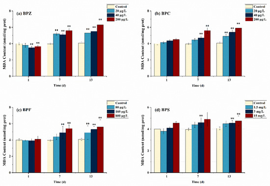 Effects of waterborne BPs exposure on the content of MDA in the tissues of zebrafish under different exposure conditions after 1, 7, and 13 days. The error bars represent the SD. The asterisks represent significant difference between treatment and control group at the same timepoint (p < 0.05, **).