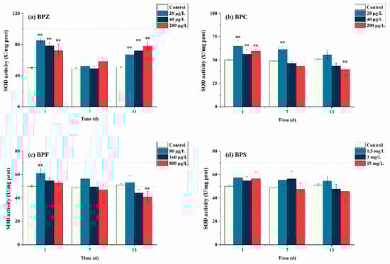 Effects of waterborne BPs exposure on the activity of SOD in the tissues of zebrafish under different exposure conditions after 1, 7, and 13 days. The error bars represent the SD. The asterisks represent significant difference between treatment and control group at the same timepoint (p < 0.05, **).