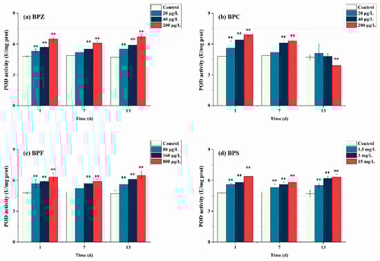 Effects of waterborne BPs exposure on the activity of POD in the tissues of zebrafish under different exposure conditions after 1, 7, and 13 days. The error bars represent the SD. The asterisks represent significant difference between treatment and control group at the same timepoint (p < 0.05, **).