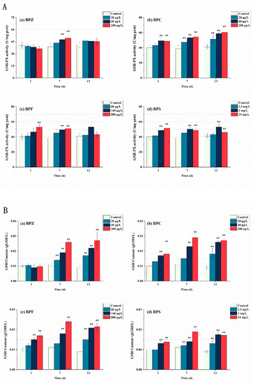 Effects of waterborne BPs exposure on the activity of GSH-PX (A) and the content of GSH (B) in the tissues of zebrafish under different exposure conditions after 1, 7, and 13 days. The error bars represent the SD. The asterisks represent significant difference between treatment and control group at the same timepoint (p < 0.05, **).