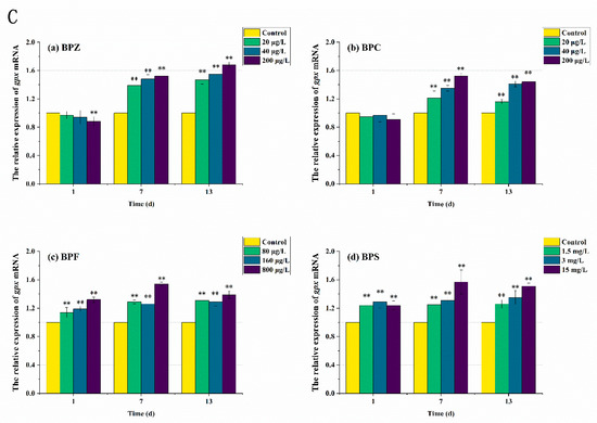 Effects of waterborne BPs exposure on mRNA levels of sod (A), cat (B), and gpx (C) in the tissues of zebrafish under different exposure conditions after 1, 7, 13 days. The error bars represent the SD. The asterisks represent significant difference between treatment and control group at the same timepoint (p < 0.05, **).