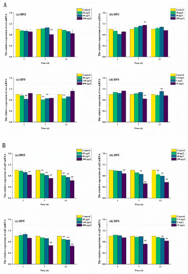 In order to further elucidate the molecular mechanism of the antioxidant reaction, mRNA transcription levels after BPs exposure were also measured. As can be seen from Figure 6 and Figure 7, the expression levels of antioxidant-related genes and estrogen receptor (ER) genes in zebrafish were disturbed to varying degrees. The results showed that compared with the control group, the sod mRNA level was up-regulated to 1.3 times after the exposure to BPs for 1 day. When the exposure time was extended to the seventh day, the mRNA level of the medium-high concentration treatments fell below the normal level, while the mRNA level of the low-concentration treatment was still higher than the control group despite the down-regulation. After 13 days of exposure, sod mRNA levels in all exposed treatments except the BPC high concentration treatment (200 μg/L) were adjusted to about the normal value, which was basically consistent with the obtained SOD activity results. These results indicated that BPs altered the activity of these antioxidant enzymes by regulating gene transcription. However, we also observed a mismatch between the activity of antioxidant enzymes and the transcriptional levels of the genes encoding them. For example, after BPZ exposure (200 μg/L) for 13 days, sod mRNA in this treatment returned to the normal level, but SOD activity still increased, which could be explained by cat mRNA. As shown in Figure 6B, although the cat mRNA level of BPZ exposure treatment was inhibited at the later stage of exposure, it was still above the control level, indicating that a high concentration of BPZ exposure made zebrafish tissues produce more CAT to help SOD remove a large number of oxygen free radicals, so as to maintain the balance of the antioxidant system. The mRNA levels of cat and gpx in other groups were up-regulated on the first day, followed by slight fluctuations, but still up-regulated in general. This was also almost consistent with the enzyme activity, indicating that the gpx gene in zebrafish tissues was not sensitive enough to the exposure of BPZ and BPC or the reaction to stress was slow. However, with the extension of exposure time, the final mRNA level was increased to 1.4–1.6 times, much higher than that in the control group. Some recent studies have shown that changes in enzyme activity do not always correspond to changes in mRNA levels of related genes, possibly because an enzyme is composed of multiple gene clusters or because of time-lag effects between transcription and translation [41,42].
