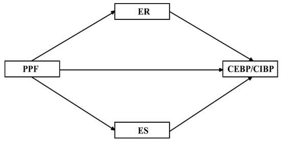 Hypothetical model diagram of the effects of parental psychological flexibility on children’s externalizing and internalizing behavior problems. PPF = parental psychological flexibility, ER = emotional regulation, ES = emotional stability, CEBP = children’s externalizing behavior problems. CIBP = children’s internalizing behavior problems.