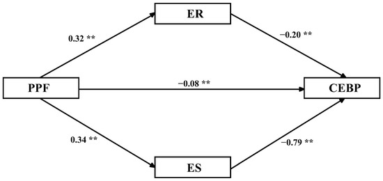 Model diagram of the effect of parental psychological flexibility on externalizing behavior problems. ** p < 0.01; PPF = parental psychological flexibility, ER = emotional regulation, ES = emotional stability, CEBP = children’s externalizing behavior problems.