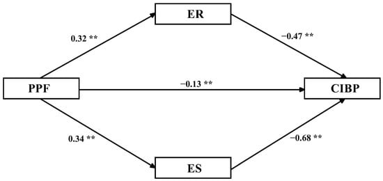 Model diagram of the effect of parental psychological flexibility on internalizing behavior problems. ** p < 0.01; PPF = parental psychological flexibility, ER = emotional regulation, ES = emotional stability, CIBP = children’s internalizing behavior problems.