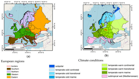Poland is located in the central part of Europe, which in many cases is specified as a region located between the west and the east of Europe. This specification is reasonable when political and economic circumstances are considered. However, the classification of regions according to the physical and climatic conditions does not include such a specific area. For example, Kondracki [27] suggests that the major part of Poland is located in Western Europe. Some very small part of the country is in Eastern Europe (Figure 1a).