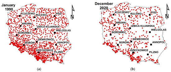 The number of available measurement stations also varied in time during the analyzed period (Figure 2a,b). In the beginning, in January 1990, the number of available stations was over one thousand. In the end, there were fewer than six hundred stations. The obvious reason for such a change was the reduction of cost related to the functioning of the meteorological network in Poland. However, it is worth mentioning that the stations are modernized and provide higher-quality results.