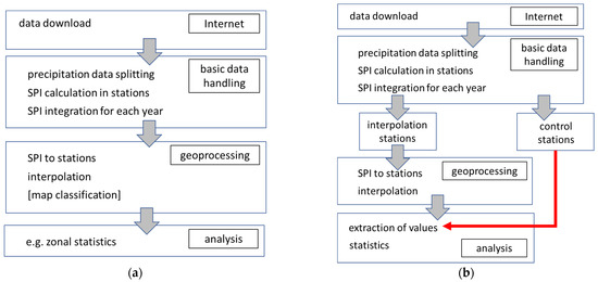 Two algorithms were created (Figure 3a,b). The first was the computational scheme of the basic interpolation (Figure 3a). The data were downloaded in the primary step. Then the precipitation was read from year-by-year files and sorted in a station-like order.
