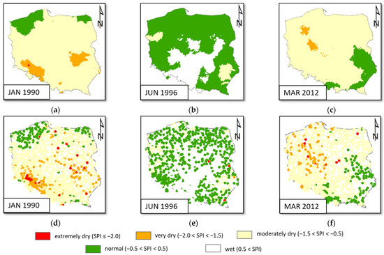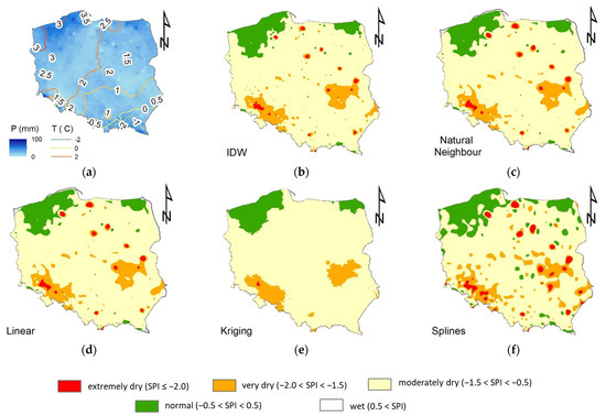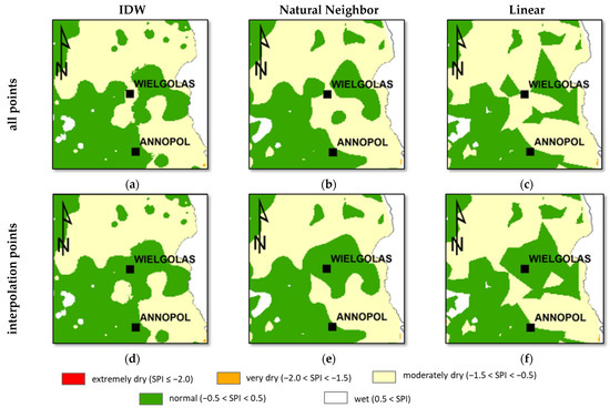 All of the methods provided compatible results, as presented on the maps. In the northern part of Poland, there are two zones of normal conditions (−0.5 < SPI < 0.5) when the majority of the country is moderately dry (−1.5 < SPI ≤ −0.5). In the central part, there are two zones of very dry conditions (−2.0 < SPI ≤ −1.5) and, in some cases, small isolated zones of extremely dry conditions (SPI ≤ −2.0). However, the latter is not visible in the Kriging interpolation (Figure 5e). The Spline interpolation gives significantly different results than the other methods. The results presented in Figure 5f are more variable. However, the differences are also clearly visible in other cases. The shapes of zones and the areas covered are different, which may also cause differences in the spatial planning of the drought prevention facilities, such as the location of the reservoirs, etc.