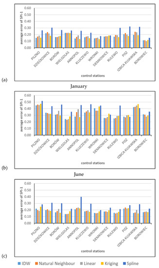The next set of exemplary results is presented in Figure 6, showing the average absolute errors between the calculated and interpolated SPI values in the control stations, as found from Equation (3). The 12 control stations are compared, and the period of averaging is 1990–2020. The results for January, June, and October are compared because some monthly patterns related to seasonal variability were noticed. In general, the errors in January were smaller than the errors in June. The results obtained for October were in between the earlier two. The errors in January were in the range of 0.15–0.30, and in June the variability was 0.25–0.50. The more moderate results of October were between 0.15 and 0.40. In all cases, the standard deviations were of the same order as the mean values, which means that sometimes the interpolation was very accurate, but in other cases it may provide values with errors much greater than the average.