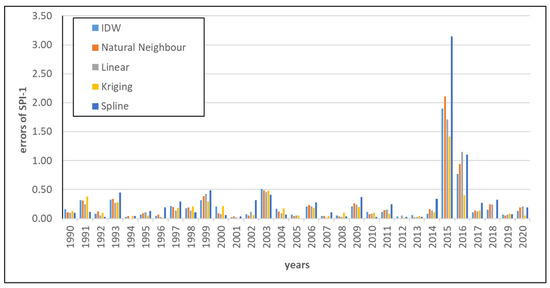 A summary of the results for the entire period is presented in Table 2, which gives the total mean errors in the interpolation of the SPI values, their standard deviations, and maximum noticed errors. It is well visible that results of the Inverse Distance Weighted method are slightly better than those provided by the Natural Neighbor and Linear methods.