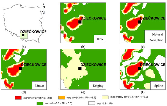 In the last years, with the development of GIS and Python applications, computer software has become the most powerful tool for mapping spatial overview changes in the environment [60]. Field measurements from meteorological stations are used to calculate continuous data based on interpolation methods and allow prediction of data in areas where in-situ data are not included. Different interpolation methods were used for mapping drought [61,62,63,64,65]. Subedi et al. [66] used the Inverse Distance Weighting IDW, Kriging, and Spline methods to analyze spatiotemporal changes during a drought in Texas, USA based on SPEI index. The results were based on the data from 47 meteorological stations collected over the years 1980–2013. The dataset included 70% of test data and 30% of validation data. Their analysis has shown that the Kriging method provides good results for dry conditions. In turn, the results based on the IDW method were correct in dry and wet conditions. The Spline method was characterized by high differences between actual measurements and interpolated data. The three techniques to map drought conditions can be ordered according to reliability as IDW > Kriging > Spline. Similar results have been obtained by Rhee et al. [56] for an analysis of drought in North and South Carolina, USA. As follows from a comparison of a few methods based on deterministic and geostatistical interpolations, IDW was the most useful method to assess drought. Ali et al. [67] used SPI to analyze drought in Iran over the years 1979–2008. Their analysis was performed using IDW, Kriging, and Spline methods based on the data from 27 meteorological stations. According to results of drought mapping, the IDW method was the most useful for assessing drought. In turn, Kumar et al. [68] chose the IDW method to analyze drought areas in India over 1951–2019 on the basis of SPI. The correlation between precipitation data and SPI was strong, and the results of mapping show that drought occurred mainly in southwest areas.