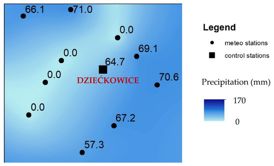 Explanation of disturbances in the measurements at the control station of Dziećkowice, January 2015: numbers are monthly sums of precipitation in control stations.