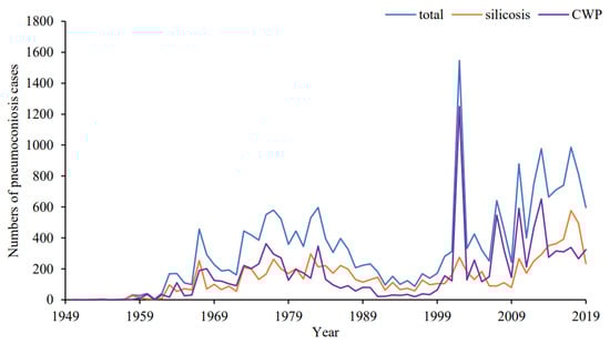 In this study, we found that new cases of pneumoconiosis have been increasing, in a fluctuating pattern, from 1949 to 2019, with similar trends for CWP and silicosis. These results are consistent with previous studies in China [,,]. A possible explanation for the increasing trend may be the rapid economic development of Hubei and the demand for coal energy. Between 1949 and 1959, only a few cases were reported, probably due to the incomplete reporting system. The promulgation of the Law of the People’s Republic of China on Prevention and Control of Occupational Diseases in 2002 may have contributed to stronger supervision measures, therefore the greatest number of new cases was observed in the same year. The increase in new cases each year since 2006 might be due to the establishment of the Network Direct Report System of Occupational diseases in 2006, which has made case reporting more comprehensive and convenient [].