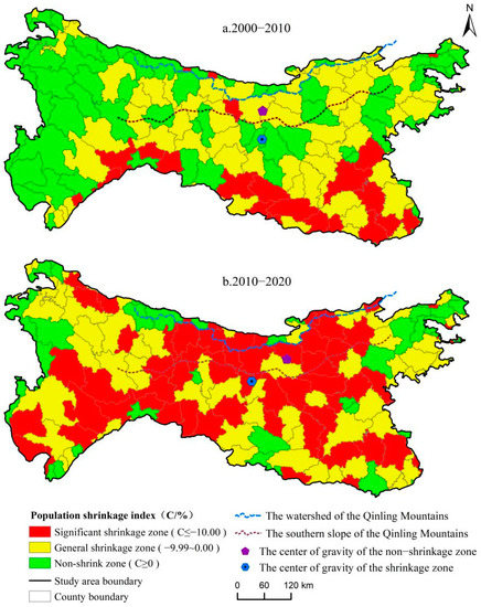 County population shrinkage patterns in North–South Transitional Zone of China (a,b) (2000–2020).