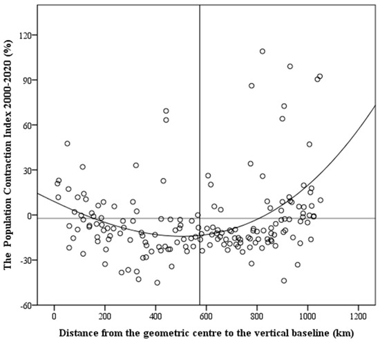 The North–South Transitional Zone of China is an ecological corridor and an important social and economic channel connecting the east and west of China. As a comprehensive representation of regional development status, the spatial differentiation of population change directly reflected the corridor characteristics of the North–South Transitional Zone of China in the “east–west” direction. Using ArcGIS 10.3, the distance between the center points of the 174 counties after centroid abstraction and the datum line was calculated with the westernmost edge of the North–South Transitional Zone of China as the vertical datum line under the geodetic 2000 projection coordinates. In SPSS, we took the distance from the west datum line as the horizontal axis and the population shrinkage index as the vertical axis to draw a scatter plot and used the mean values of the horizontal and vertical coordinates as the benchmarks to draw the secondary coordinate axis, dividing the scatter plot into four quadrants (Figure 3).
