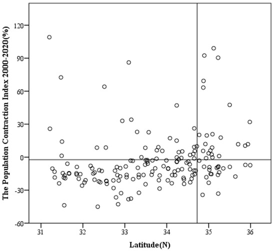 The Qinling–Huaihe Line, where the North–South Transitional Zone lies, is the dividing line between the northern and southern regions of China. Between the north and south sides of the line, there are obvious regional differences in natural geographical conditions, agricultural production, living customs, and regional socio-economic development. In order to explore the spatial differentiation of population shrinkage on both sides of the North–South Transitional Zone of China, which is dominated by the Qinling Mountains, the northern and southern foothills of the Qinling Mountains were divided by the Qinling Mountains watershed, and we took latitude as the horizontal axis, the population shrinkage index as the vertical axis, and the population shrinkage index and the average latitude of the Qinling Mountains watershed as the benchmarks to draw the secondary coordinate axis, dividing the scatter plot into four quadrants (Figure 4).