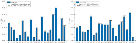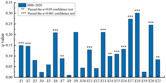 From 2000 to 2020, the natural factors of mean elevation (X1), topographic relief (X2), and ecological environment (X3) passed the significance test with q-values of 0.149, 0.146, and 0.080, respectively (Figure 4). This indicated that, across the whole population-shrinkage period, mean elevation (X1) and topographic relief (X2) played an important role in the regional population shrinkage. The ecological environment (X3) also played a role.