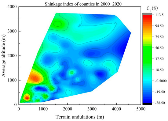 In order to accurately portray the influence of topographic conditions on population shrinkage in the North–South Transitional Zone of China, two natural-factor indicators with similar q-values, namely, average elevation (X1) and topographic relief (X2), were selected, and population shrinkage contour maps of the counties were drawn for the whole study period with average elevation (X1) as the vertical axis and topographic relief (X2) as the horizontal axis (Figure 7). The results showed that from 2000 to 2020, the average elevation of counties with significant population shrinkage was concentrated between 1000 and 1500 m, and their topographic relief was above 1500 m, which indicated that topographic factors played an important role in the overall population shrinkage in the North–South Transitional Zone of China. For example, the population shrinkage indices of the Qingchuan and Pingwu counties in Sichuan province were −38.29% and −32.72%, respectively; their average elevation was above 1200 m; and their topographic undulations are evenwere above 3200 m and 4100 m, respectively.
