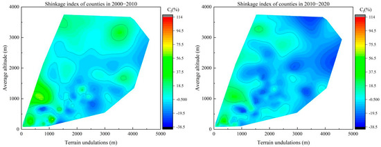 The contour map of population shrinkage by time period showed that the natural factors in the North–South Transitional Zone of China had a strong endogenous rooting effect on the formation of the spatial pattern of population shrinkage (Figure 8), and topographic relief (X2) and average altitude (X1) had an important influence on the population shrinkage of each county. From 2000 to 2010, the average altitude of the shrinking counties was concentrated between 500 and 1500 m, and the topographic relief was between 1500 and 3500 m, while the counties with an average altitude above 2500 m were in a state of population expansion. This was because the counties with a higher altitude are mainly located in the western part of the North–South Transitional Zone of China, which is home to ethnic minorities, whose traditions cause these counties to be sparsely populated. For example, the total fertility rate of the Aba Prefecture in Sichuan Province and the Linxia Prefecture in Gansu Province were 1.57 and 1.72, respectively, at the time of the Sixth Five-Year Plan, more than 30% higher than the total fertility rate of their provinces. From 2010 to 2020, counties with population shrinkage expanded rapidly in areas with a high altitude and considerable topographic relief, and population shrinkage occurred in all counties with topographic relief over 3000 m. This indicated that the driving influence of topographic relief on regional population shrinkage was significantly enhanced, and the population shrinkage in counties constrained by both high altitude and high topographic relief (most of which were persistently shrinking counties) was more serious than that in counties constrained by a single topographic factor. For example, the Pingwu and Wenchuan counties in Sichuan province were both persistently shrinking counties, with population shrinkage indices of −32.72% and −25.88%, respectively, during the study period. The average elevation of these two counties was above 2000 m, and their topographic relief was above 4100 m and 4500 m, respectively. From the comparison of the two study periods, the average altitude and topographic relief of the counties with significant population shrinkage in the North–South Transitional Zone of China increased over time, and the counties with a high altitude and high topographic relief gradually became the hardest-hit areas for population shrinkage.