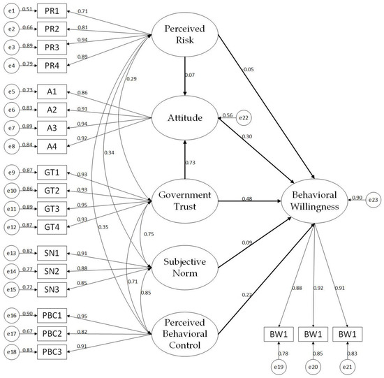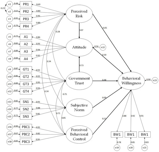 Cronbach’s α was employed to test the internal consistency of the constructs. If Cronbach’s α is greater than 0.7, reliability is acceptable [72]. With the assistance of SPSS 24.0, overall Cronbach’s α and each construct’s α values were obtained. Table 5 shows that the Cronbach’s α of attitude, subjective norm, perceived behavioral control, perceived risk, government trust, and behavioral willingness are 0.949, 0.907, 0.915, 0.906, 0.965, and 0.932 respectively. Overall, Cronbach’s α is 0.953. All α values exceeded 0.7, indicating a considerately high reliability of the collected data. Additionally, the KMO value was 0.952, and the p-value was below 0.001, indicating that the data was suitable for factor analysis [18].