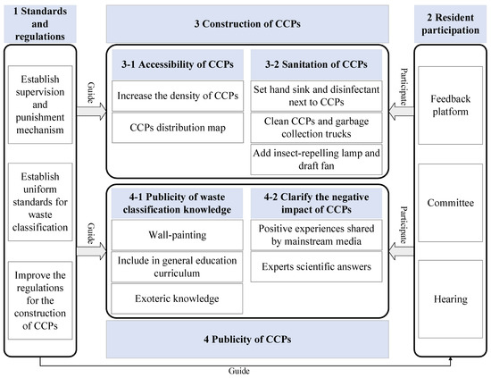 Globally, the phenomenon of waste siege is becoming increasingly severe, which seriously damages the image of cities and potentially threatens the physical and mental health of residents [1,2,3]. In China, the previous strategy of mixed collection, centralized transportation and centralized treatment, commonly known as the three-stage management, can no longer effectively manage the increasing amount of waste in the future [4]. The Centralized Collection Points (CCPs), referring to a collection of color-coded containers with visibly marked signage and sorting information, which specifically collect recyclables, compostable, electronic waste, etc., begin to attract people’s attention. Because CCPs can largely improve the efficiency of waste treatment, facilitate the waste recycling and beautify the urban environment, China had already propagated the slogan “classify waste, and discard waste in CCPs” since the early 1950s, and issued several national and local regulations about proper waste management, which, however, received few satisfactory outcomes. To further improve ecological civilization, the Notice on Comprehensively Carrying out the Sorting of Municipal Solid Waste in Cities at and Above the National Level was issued in 2019. Barrels were replaced with CCPs for waste collection in eight first-tier cities, including Beijing, Shanghai, Guangzhou, Shenzhen, Hangzhou, Nanjing, Xiamen, and Guilin [5].