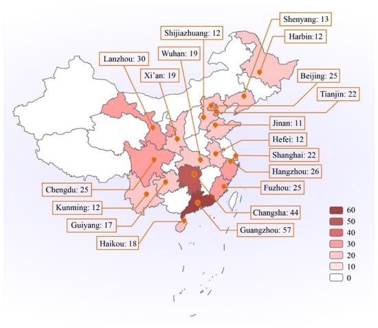 Darker colours on the map (Figure 1) represent greater numbers of participants. This study recruited 421 participants from the targeted cities in mainland China. The average number of participants per city was 21. There were variations, however, with the fewest individuals supplied by Jinan (n = 11), and a relatively large sample from Guangzhou (n = 57). In terms of ideal sampling, the objective was for each city to provide 20 participants. Discrepancies in participant numbers in certain cities may have been due to the nature of the online survey; obtaining an exactly equal number of individuals for each locale was always unrealistic. The researcher conducted the same recruitment method in each city (e.g., finding potential candidates, distributing the survey on social media in each city). The rate of response was stronger in southern and eastern coastal areas than in northern or inland regions.