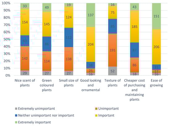 Additionally, to better understand the ownership of houseplants of the participants, preferable characteristics of plants were asked (see Supplementary Materials Section S3). This measure comprised six items, which were rated on a five-point Likert scale from “extremely unimportant” to “extremely important”. Items in this measure included: “nice scent of plant”, “small size of plants”, and “green coloured plants”, and which were items adopted from a previous study [17].