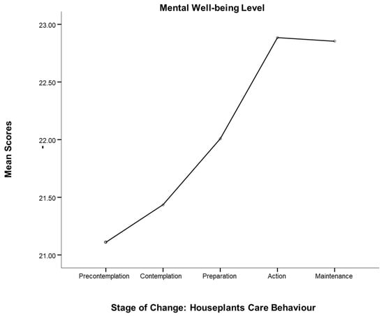 Furthermore, as Figure 3 below shows, participants who identified themselves in latter stages of houseplants care behaviour evinced a greater level of mental well-being. From the stage of pre-contemplation through to the action stage of home planting, levels of well-being rose sharply, and this increase persisted in a stable manner from the stage of action to that of maintenance.