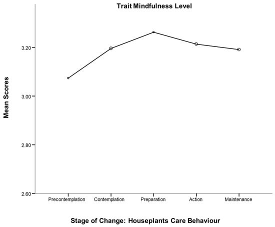 There was a significant houseplant group difference for overall trait mindfulness, F (4, 400) = 3.85, p < 0.01, η2 = 0.04. The scores increased from the stage of pre-contemplation to that of preparation (determination), with a peak value in the preparation stage. Subsequently, the mindfulness levels increased, and remained stable in the contemplation and maintenance stages (see Figure 4). A post hoc test indicated that the overall mindfulness scores in the pre-contemplation group were significantly different from those in contemplation (p = 0.01), preparation (p < 0.01), action (p < 0.01) and maintenance (p < 0.01) groups. Moreover, the contemplation group did not show significant differences to any other groups on the score of overall mindfulness.