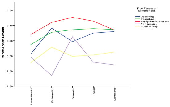 Post hoc tests indicated that levels of observing in the pre-contemplation group were significantly different; it decreased from pre-contemplation to preparation, and then increased to action (p = 0.04) and maintenance (p < 0.01) groups; contemplation and preparation groups were not significantly distinct from other groups on observing scores. Additionally, for describing levels, similarly, the pre-contemplation group was only significantly different from action (p = 0.04) and maintenance (p = 0.02) groups.