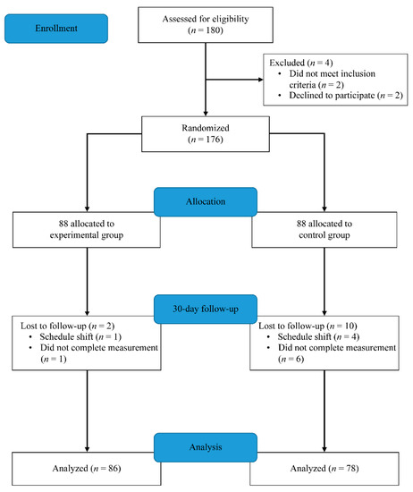 In this study, a total of 180 nurses were screened for research qualifications. Of those, four (1%) were found to be ineligible for the following reasons: (1) did not meet inclusion criteria or (2) refused to join this study. The remaining 176 individuals who met the study eligibility criteria agreed to participate and were randomized; 12 nurses (2 experimental, 10 control) were excluded from analyses because their schedule prevented them from completing this study, and the dropout rate was 6.8%. Eighty-six nurses in the experimental group and 78 nurses in the control group were included in the data analysis (Figure 1).