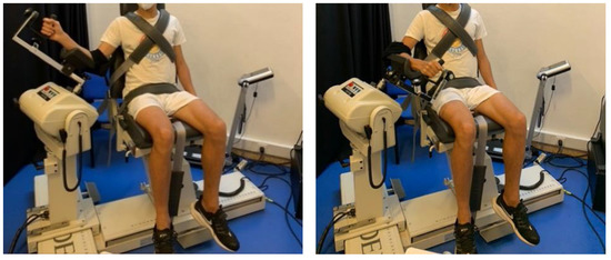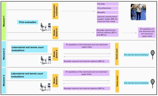 The experiments described in Figure 1 were completed without vigorous efforts in the prior 24 h. In the first moment, we conducted a general anthropometric characterization using an adipometer (Holtain Skinfold Caliper, UK), a metric tape (Sanny, Brazil), a stadiometer (Seca 222, Belgium), and a body composition (InBody 120, Korea) in accordance with the recommendations of the International Society for the Advancement of Kinanthropometry (ISAK). Then, players executed a standardized warm-up consisting of 5 min of elastics exercises and 10 min of dynamic stretching [31]. Five submaximal shoulder rotations in an isokinetic dynamometer (Biodex System 4, Biodex Medical Systems, NY, USA) were performed for familiarization, and immediately, ten shoulder external and internal rotations of the dominant and non-dominant upper limbs were performed at 90 and 180°/s (with 3 min intervals between test velocities; Figure 2) [32]. These evaluations allowed us to obtain the isokinetic variables (e.g., torque) for each experimental condition. The following equation allowed for determining the peak torque symmetry index [33]: