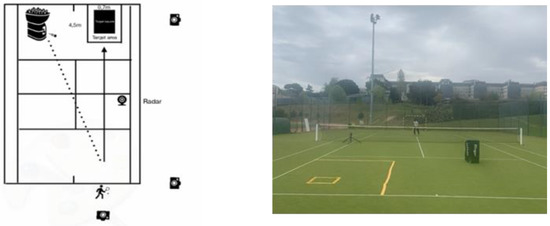 Experiments conducted on the tennis court and the respective ball machine, marking tapes, video cameras, and radar (left and right panels).