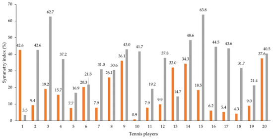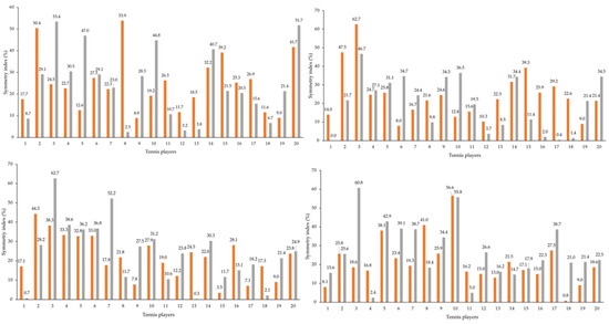 In this study, the peak torque symmetry index between the dominant and non-dominant upper limbs showed that the shoulder’s external and internal rotations presented abrupt asymmetry between limbs (e.g., before the five forehands, the external and internal rotations showed values of 30.5 and 22.7%, respectively). It was also evident that after the ten forehands, some players presented lower symmetry indexes due to the unused non-dominant upper limb and the lack of dominant limb strength after use, which decreased the index. In comparison with other studies, it was verified that the dominant upper limb’s external and internal rotations also presented high symmetry index values (external/internal rotation symmetry index: 33.0/34.4%) [49].