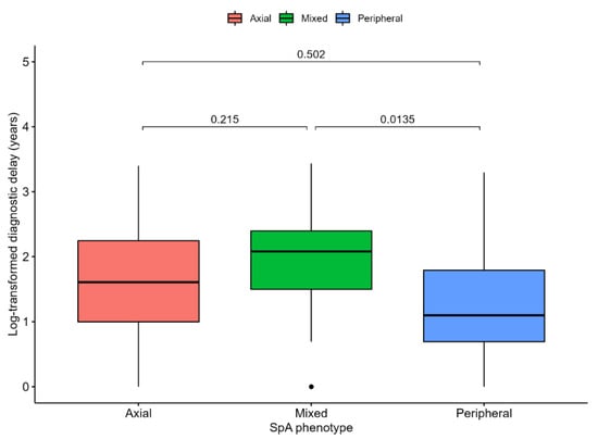 Diagnostic delay from symptom onset to disease diagnosis expressed in years and log-transformed (y axis is transformed to reflect a priori values) compared across spondylarthritis phenotype. ANOVA test p value = 0.016. p-values for comparison are shown and are based on Tukey’s post hoc tests.
