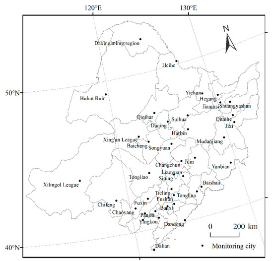 In this paper, Northeast China was selected as the study area, including Heilongjiang Province, Jilin Province, and Liaoning Province, as well as Hulunbuir, Chifeng, Tongliao, Hinggan League, and Xilin Gol League of the Inner Mongolia Autonomous Region, with a total area of about 1.52 million km2. The study area is bordered by North China to the south, Russia to the north, Japan across the sea to the east, and the Inner Mongolia Autonomous Region to the west. The terrain is mainly plains, hills, and mountains. The main geographical features include the northeast plains and the Greater Khingan Mountains, Lesser Khingan Mountains, and Changbai Mountains. The forest coverage in the study area was 47.2%, significantly higher than the national level (23.0%). This region is an important grain production area for China. The northern part of Northeast China is in a cold temperate zone, while the southern part is in a warm temperate zone. According to the China Meteorological Data Network, the annual temperature difference between the northern and southern portions was as high as 10.8 °C in 2020. In recent years, due to the increasing clean energy capacity in Northeast China, particulate pollutants such as PM2.5 and PM10 have been gradually decreasing, but ozone pollution has continued to increase [17].