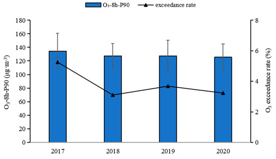 The mean annual concentrations of O3-8 h-P90 in Northeast China from 2017 to 2020 were 134 μg·m−3, 127 μg·m−3, 127 μg·m−3, and 125 μg·m−3, respectively (Figure 2), which were lower than the national secondary standard (160 μg·m−3). Compared with 337 cities in China, this region was 12.5% lower than average, making it a low O3 concentration area. On the whole, the O3 concentration decreased by 6.7% during 2017–2020. However, the variance analysis showed that there was no significant change in the O3 concentration during the 4 years (p = 0.265), so the average O3 concentration could represent the overall pollution level in the recent years. Our result was slightly lower than the O3 concentration reported by [22] from 2015 to 2018 (131–138 μg·m−3), which was mainly due to the scope of the study area. Five league cities with low O3 concentrations (annual average of 82 μg·m−3), including Chifeng, Tongliao, Hulunbuir, Hinggan League, and Xilin Gol League, were included in the present study. In terms of O3-8 h in Northeast China (Figure 2), the annual over-standard rates (O3-8 h concentrations greater than secondary standards) were 5.25%, 3.1%, 3.68%, and 3.23% from 2017 to 2020, respectively, with the O3 pollution conditions being mainly categorized as excellent and good. In the past four years, the O3 concentration has exhibited the same trend as the over-standard rate, roughly decreasing each year, suggesting that O3 pollution control has had a notable impact.