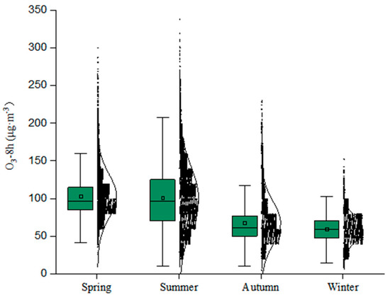 Seasonal variation in of O3-8 h from 2017 to 2020 in Northeast China. (The middle horizontal line of the boxplot represents the median O3 concentration; the top and bottom of the box are the top quartile and the bottom quartile. The scatter plot to the right of the boxplot represents the distribution of O3 concentration, and the curve represents the trend of O3 concentration).