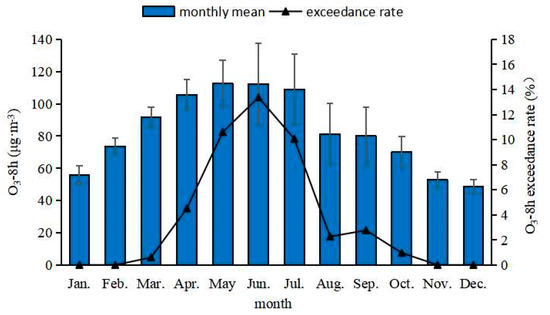 From 2017 to 2020, the month-to-month trends in O3-8 h concentrations in Northeast China showed obvious inverted “V” patterns of first increasing and then decreasing during each year (Figure 4). The O3 concentration increased gradually from January to May, with a monthly increase of 0.98 μg·m−3 followed by a slow monthly decrease of 0.955 μg·m−3 from June to December. The highest O3 concentration was 2.3 times the lowest value. The monthly average over-standard rates in the past 4 years demonstrated that the changes of O3 concentrations and over-standard rates in Northeast China have been generally consistent. The O3 over-standard rates from May to July were the highest at 10.6%, 13.4%, and 10.1%, respectively. The over-standard rates from March to April and August to October were all lower than 5%. It is worth noting that O3 pollution did not exceed the standard in January–February and November–December, indicating that O3 generation was slow in late autumn and the winter in Northeast China. This may have been because the temperatures in Northeast China during these periods are extremely low and the daily sunshine is limited, thus inhibiting the generation of O3. O3 is generated by a photochemical reaction with VOCS, NOX, and other precursors under the action of solar radiation, and its reaction speed is positively correlated with temperature. In late autumn, the temperature drops to below 0 °C, and with the temperature decreasing, the photochemical reaction speed slows down accordingly, so the generation of ozone is slow. In addition, precipitation in Northeast China is relatively high in the winter, which can enhance the settling and clearing of atmospheric O3 [16].