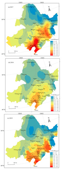 Annual spatial distributions of O3 concentrations from 2017 to 2020 in Northeast China.