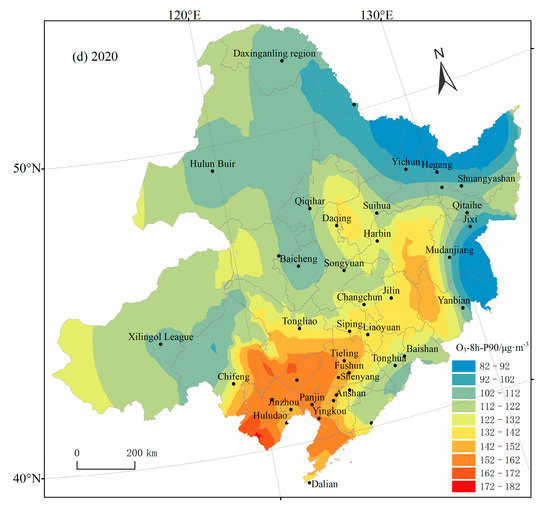 - Gao, C.; Xiu, A.J.; Zhang, X.J.; Chen, W.W.; Liu, Y.; Zhao, H.M.; Zhang, S.C. Spatiotemporal characteristics of ozone pollution and policy implications in Northeast China. Atmos. Pollut. Res. 2019, 11, 357–369. [Google Scholar] [CrossRef]