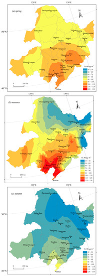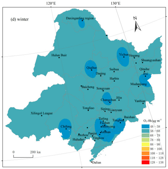 The spatial distributions of O3-8 h concentrations in Northeast China changed significantly among the seasons (Figure 6), and the variation coefficients in the spring, summer, autumn, and winter were 9.03%, 21.5%, 15.34%, and 6.75%, respectively. In the summer, O3 pollution was the most serious, and the spatial variation was most pronounced, with the highest value being 2.2 times the lowest value. The main reason for the most serious O3 pollution in the summer is the long sunshine time in the summer, the strong solar radiation, and the high temperature accelerates the photochemical reaction of ozone, so that the ozone concentration rises. The O3 concentrations gradually increased from north to south, with the highest concentration in Liaoning Province (123 μg·m−3), followed by Jilin Province (101 μg·m−3) and the five cities of the Inner Mongolia Autonomous Region (102 μg·m−3), and the lowest concentration in Heilongjiang Province (77 μg·m−3). In the autumn, the O3 concentrations decreased by 35% in Heilongjiang Province, 53% in Jilin Province, 58% in Liaoning Province, and 52% in the five cities of the Inner Mongolia Autonomous Region. In the autumn, the spatial differentiation of the O3 concentrations weakened in the low-value areas in the north but still exhibited high spatial variability in the high-value areas in the south. The O3 concentrations in the spring were generally higher than in the autumn, but the spatial distributions were generally similar. The average O3 concentrations in the winter were the lowest, when the spatial variation was also the smallest, in the range of 51–69 μg·m−3. The main reason for the seasonal spatial variability in the O3 concentrations was the large temperature difference between the north and south in the summer and the low average temperature in the winter in Northeast China. This agrees with previous reports of a positive correlation between temperature and O3 concentrations.