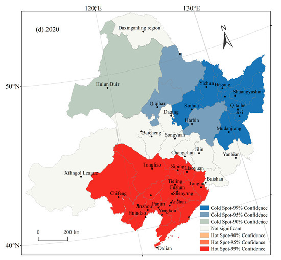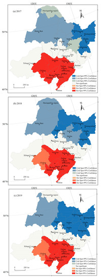 Global spatial autocorrelation (Moran’s I) can reflect the overall aggregation or dispersion in a regional space but cannot reflect locally specific conditions. In the current research, the Getis–Ord (Gi*) cold–hot spot analysis was used to assess the O3-8 h-P90 aggregation characteristics in Northeast China in 2017–2020. If Gi* exceeds the 90% confidence level, it indicates that the area and surrounding areas are hot zones that have high O3 concentrations; otherwise, the areas are identified as cold spots with low O3 concentrations. Areas that fail the significance test are said to exhibit no spatial aggregation characteristics and show discrete distributions. The calculation result of Gi* is the Z value, and the higher the Z value, the tighter the clustering of a hot spot area is; conversely, the lower the Z value, the tighter the clustering of a cold spot area [21].