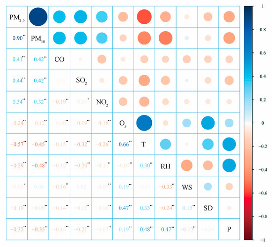 Correlation coefficients among meteorological factors and atmospheric pollutants. (T: temperature, RH: relative humidity, WS: wind speed, SD: sunshine duration, and P: precipitation. ** Indicates that the correlation is significant at the level of 0.01, and * indicates that the correlation is significant at the level of 0.05.)
