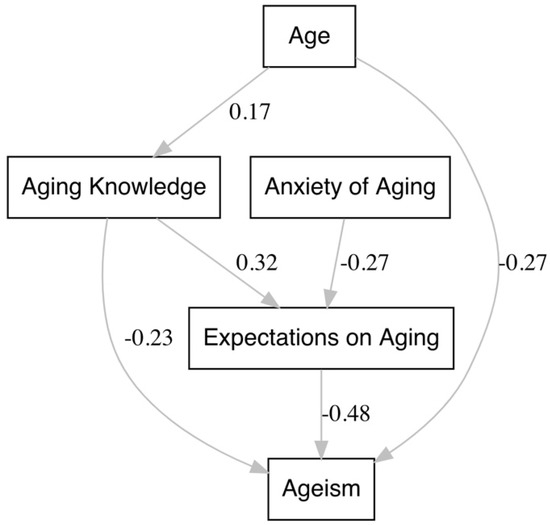 The final model showed that greater aging knowledge ( = −0.23) and increased age of the health professional ( = −0.27) were associated with diminished ageism. Similarly, holding higher expectations regarding aging ( = −0.48) was also associated directly with lower ageism while also mediating indirect effects of aging anxiety and knowledge on ageism. That is, greater aging anxiety negatively impacted one’s expectations regarding aging ( = −0.27), which in turn was associated with a weak increase in ageism ( = 0.13). Notably, the direct effect of aging anxiety on ageism tested in the conceptual model produced a coefficient that was negligible and non-significant resulting in it being dropped from the final model. Considering these final results substantiates the notion that aging anxiety precedes expectations regarding aging and subsequently impacts ageism. Finally, greater knowledge of the aging process also influenced ageism directly ( = −0.23) and indirectly ( = −0.15) by increasing one’s expectations regarding aging ( = −0.32), in both instances attenuating ageist attitudes.