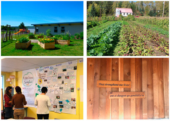 Some food-related initiatives (i.e., school-based food programs, food security work and youth-based land programming) had been taking place in the region prior to the beginning of the LC Initiative in 2016. A Wellbeing Model had been developed by the GGC that aimed to depict the balance between personal, political, social and spiritual aspects of life links healthy people, healthy communities, and healthy lands [32]. This model included a photovoice mural project and aimed to provide a way for community members to engage with Gitksan culture. Chronic illness and health, along with food insecurity, had been identified by the community in a Community Planning process prior to 2016, as key issues that needed to be addressed.