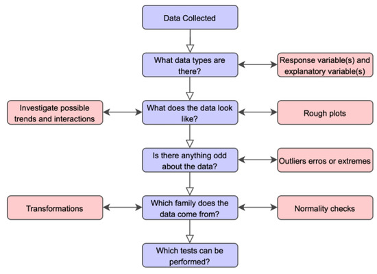The exploratory data analysis method was chosen with the goal of identifying, knowing, and understanding the trends presented in the data according to the steps suggested by Cox [18]: (i) Data are collected; (ii) What data types are there? (iii) What do the data look like? (iv) Is there anything odd about the data? (v) Which families do the data come from? and (vi) Which tests can be performed?